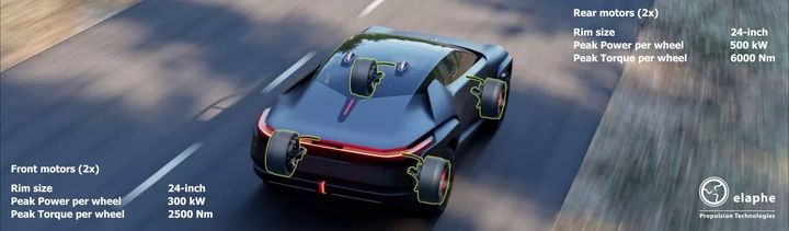 Elaphe has introduced a motor technology known as Sonic 1, capable of delivering a peak power of 255 kW (341 hp) in brief intervals. It can maintain a continuous output of 200 kW (268 hp) for each wheel. According to Italdesign, the enhanced motors that Elaphe is developing for the Quintessenza will offer even greater power.